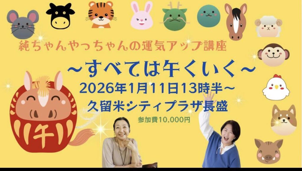 「毎年楽しみにしています」その一言が嬉しくて今年も久留米で純ちゃんやっちゃんの運気アップ講座「全ては午(うま)くいく」をテーマに、ドクター西村靖子先生と運命好転学 福田純子でお届けします。